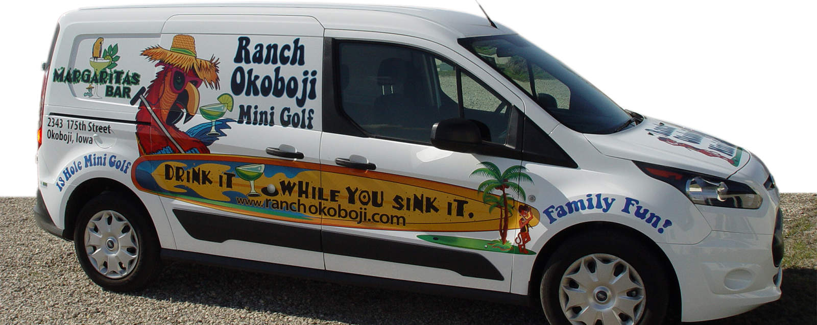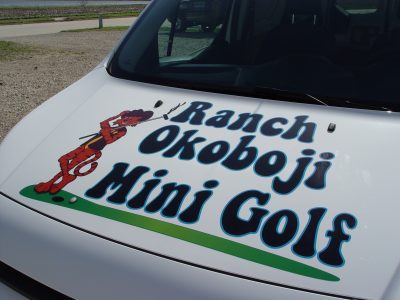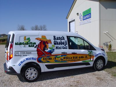 Ranch Okoboji wanted a van wrap that was fun and colorful just like their mini golf resort activities, gift shop and margaritas bar. You won’t miss this creative and fun vehicle showcase. Design and Wrap by Okoboji Graphics.